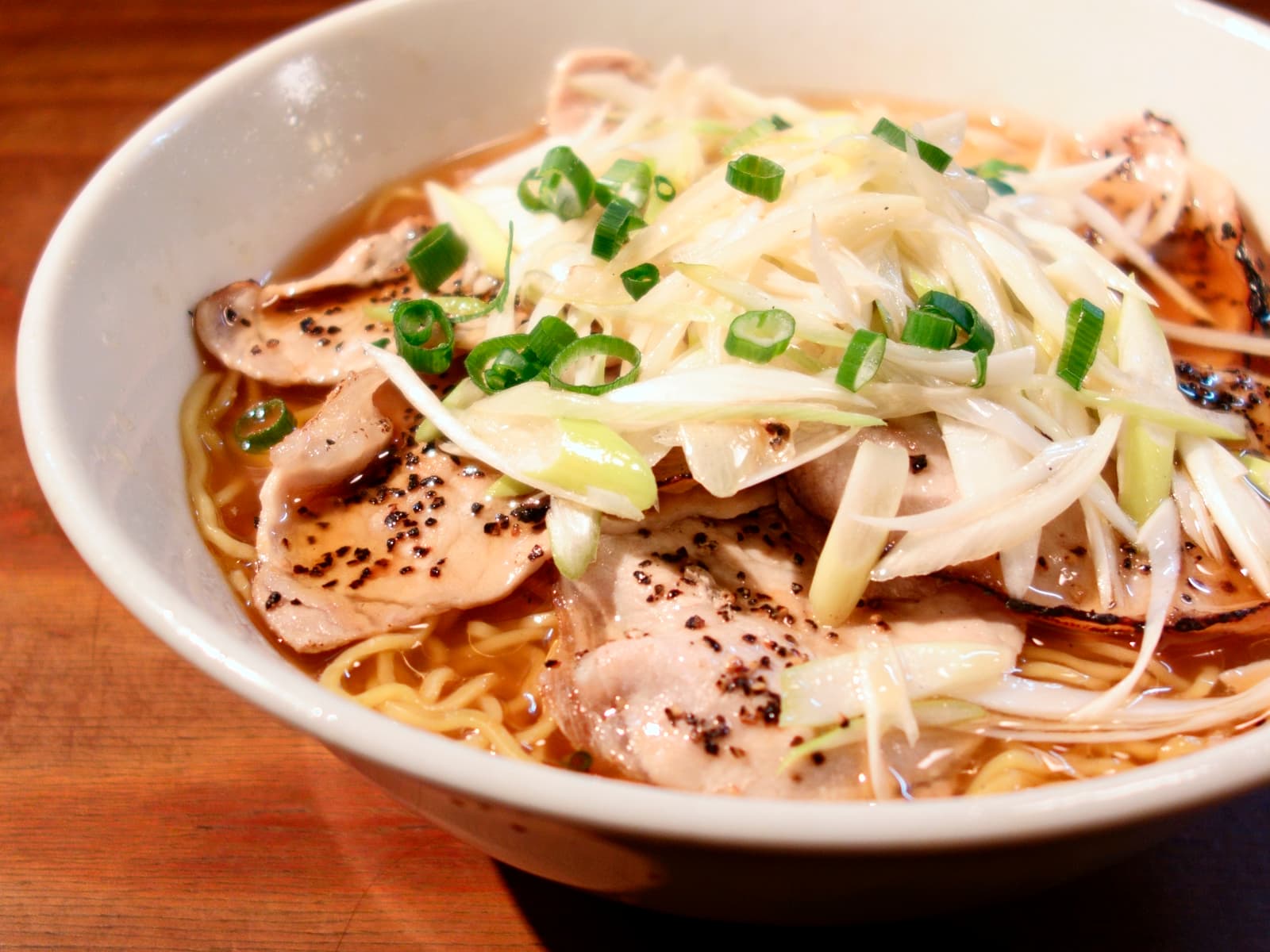 シャブ肉を炙り、長ネギとともにのせ、上から熱々のキャノーラ油をかけました。